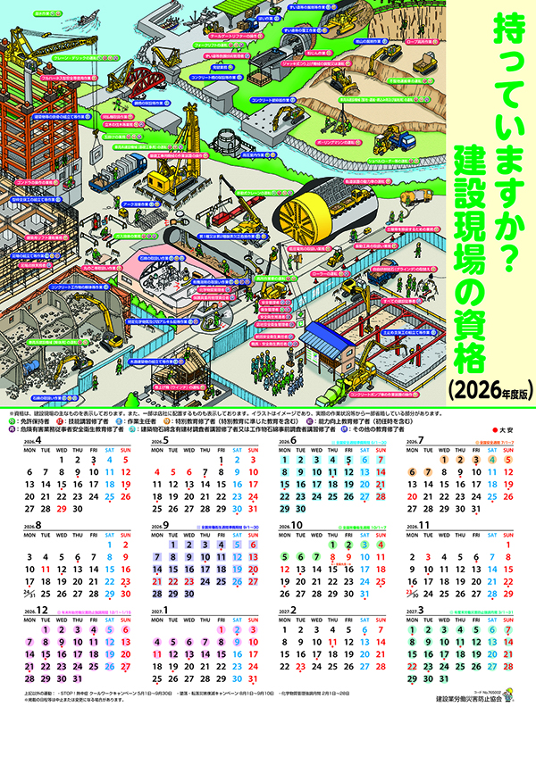 建設業労働災害防止協会(建災防、今井雅則会長)は「作業の資格カレンダー(持っていますか?建設現...