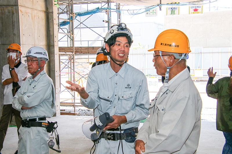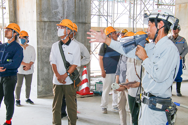 津久見市と㈱末宗組(宇佐市、末宗信市社長)は9月26日、2026年度の供用開始を目指して工事を進めている津久見市新庁舎の建設現場で工事見学会を開いた。2回目の見学会で、市内の11人が参加した。