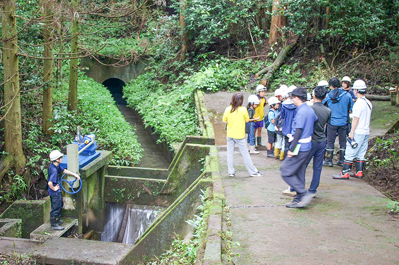 児童は同改良区が管理する第二幹線水路(1926年完成)に移動。白水の滝から取水していることや、水門の役割などを聞いた後、水を止めた水路の隧道(延長111㍍、高さ175㌢)を歩いて見学した。
