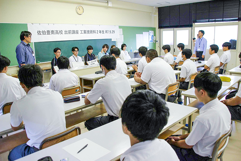 佐伯河川国道事務所は先に、佐伯豊南高校工業技術科2年生20人を対象にした出前講座を行った。昨年10月、同じ生徒らが1年次に開いた出前講座に続くもの。前回は建設業に興味を持ってもらおうと実施したが、今回はさらに「進路選択の候補の一つ」として、若手職員らが仕事内容、働き方、やりがい、給与、福利厚生など業界のリアルな姿を伝え、人材確保につなげる狙い。出前講座は今回で7回目。