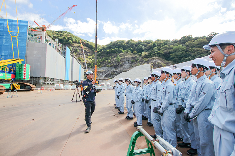 全員が集合し、生徒代表の行村隆之介さんが「日々の授業と違った貴重な体験となり大きな学びとなる。建築の奥深さを感じ進路選択の参考にしたい」と見学会への決意を述べ、西松建設の宮本睦巳工事所長が「現場を肌で感じ、ものをつくる、建物を建てることはやりがいのある仕事だと思ってほしい」と呼び掛けた。