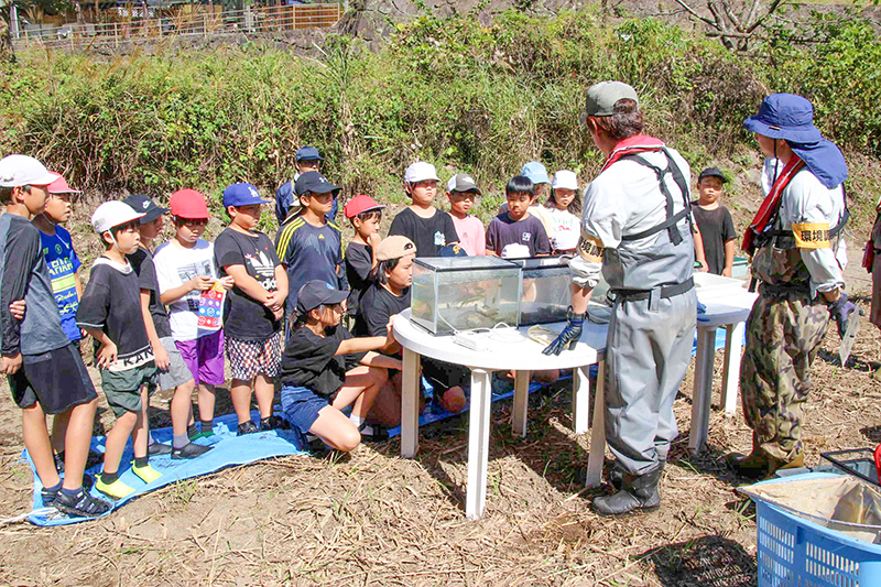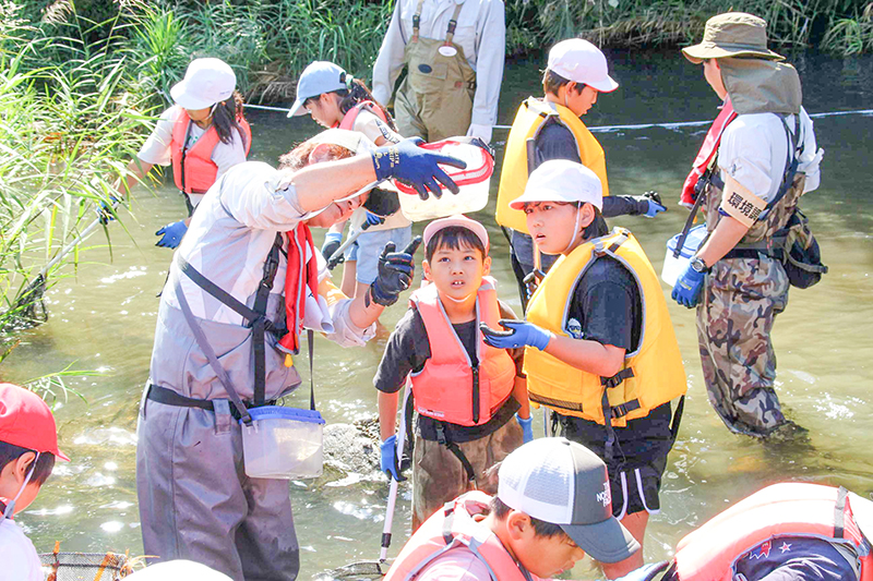 川の体験学習では、ライフジャケットを身に着け、一斉に手にしたタモ網で魚やカエル、昆虫などを採集。捕まえた生物は水槽に入れ、職員らの説明を聞きながら興味深そうに観察した。