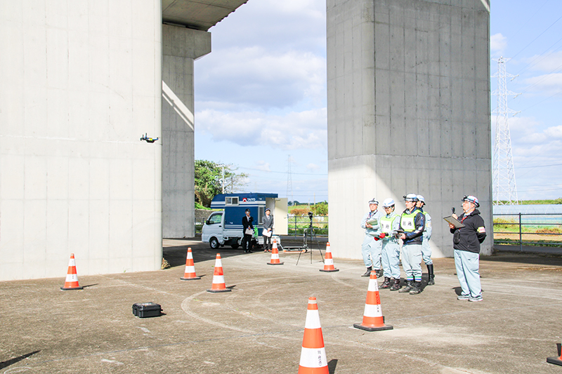 競技は①高所作業車実技②高解像度カメラ実技③ドローン撮影実技の三つ。作業開始前ミーティングに始まり作業指示、機器操作、画像の出来映えなど一連の流れを競った。