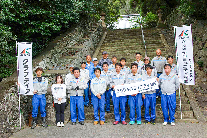 ㈱クラフティア佐伯営業所(城信政所長)は21日、毎年行っている社会貢献活動「さわやかコミュニティ旬間」(14~24日)の一環として、佐伯市臼坪の五所明神の参道、境内と周辺で清掃活動をした。