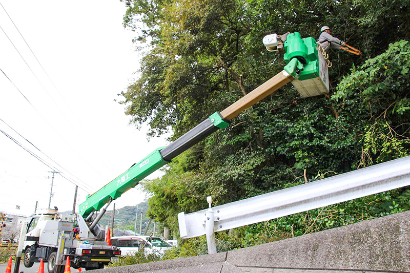 清掃活動には、城所長をはじめ市内在住のOBなど約20人が参加。2台の高所作業車などを使って、枯れた枝や支障木を刈り取ったり、ごみ拾いや草取り、落ち葉かきなどに汗を流した。
