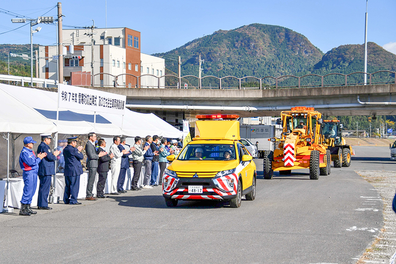大分河川国道事務所は先に、玖珠町の玖珠川河川敷で今冬の雪寒対策に向けた雪寒対応出陣式をした。除雪・融雪作業を担う道路維持工事受注業者や災害協定締結事業者、各道路管理者、九重町長ら30者、69人が参加し、冬期の道路安全確保に向けて士気を高めた。