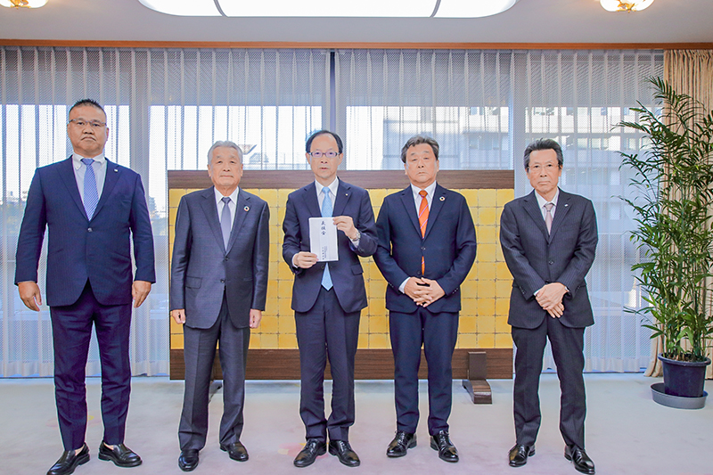 県建設業協会の友岡孝幸会長と3副会長らは5日、県庁に佐藤樹一郎知事を訪れ、各支部から寄せられた大分市佐賀関大規模火災の義援金を贈呈した。