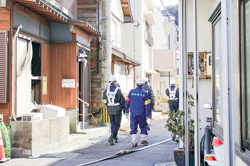 石綿があった場合に備え、松島署長らは防塵マスクを着用し、大分市消防団下浦分団第3部の車庫前の小道から現場内に入り、焼失した家屋や建物の状況、現場内の道路、現在行われている作業の安全対策などを細かく確認した。