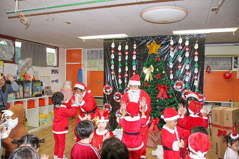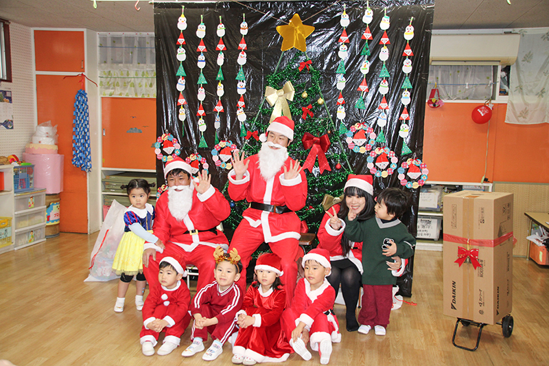 同社はボランティア活動の一環で、夏には小学校のプール掃除などをしているが、クリスマスのイベントは初めての試み。近隣のひおか保育園とめぐみ保育園も訪問し、お菓子や空気清浄機を贈った。