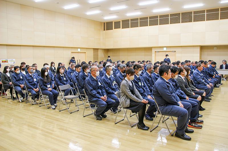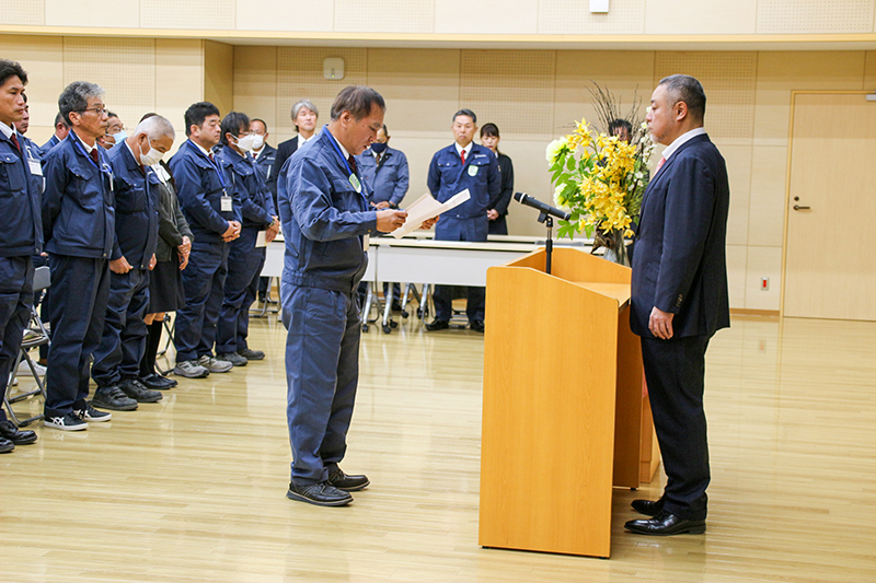その後、工事功労表彰、永年勤続表彰、工事・販売協力者の紹介のほか、新入社員および辞令発令の紹介などが行われた。最後に従業員を代表して工事部工務課の大橋裕幸さんが「会社発展のため積極的に業務に取り組み、社員が一丸となって日々努力していく」と誓いの言葉を述べ、全員で組歌を唱和した。