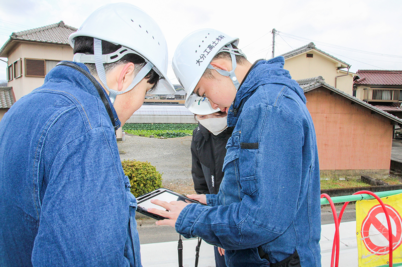 その後、生徒は2班に分かれ、ICT機械とBIM/CIMのARを体験。㈱平神工業(大分市廻栖野)が担当したICT機械体験は、データ入力した車載モニタを見ながらのり面整形を行うバックホウの操作を見学。㈱コイシ(大分市横尾)が担当したAR体験では、タブレット端末を使って施工前の現場と完成イメージを重ねる技術を体験した。