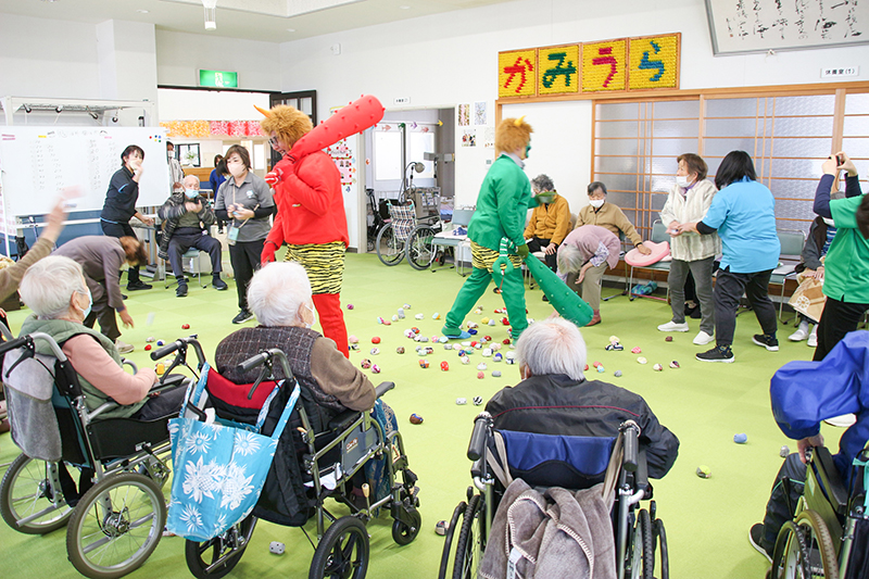 デイサービスセンターでは利用者22人。放課後児童クラブでは5人の児童と職員らが「鬼は外。福は内」と豆を投げつけて鬼を追い払うなど、笑顔と歓声に包まれ、終わりにお菓子がプレゼントされた。