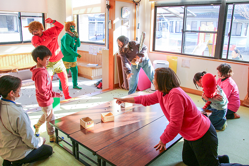 佐伯市の㈱谷川建設工業(谷川雄太社長)は3日、同市上浦町デイサービスセンターと同放課後児童クラブに社員2人が鬼に扮して訪れ、節分の豆まきに参加した。社会貢献活動として毎年実施しており、今回が3回目。