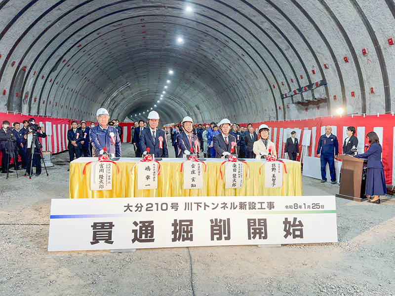 九州地方整備局大分河川国道事務所が日田市川下の国道210号改良事業の一環で新設している川下トンネル(仮称)の貫通式が、先に現地で開催された。