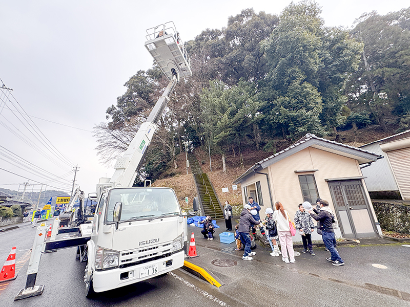 施工業者や日田土木事務所、消防、警察など関係者や地元住民ら約180人が参加。つきたての餅やぜんざいが振る舞われ、バックホウや高所作業車、パトカー、白バイ、消防車両の試乗体験のほか、未来の現場を仮想空間で体感できるVR体験など多彩な催しがあった。子どもたちは普段間近で見ることの少ない重機や車両に興味津々の様子だった。
