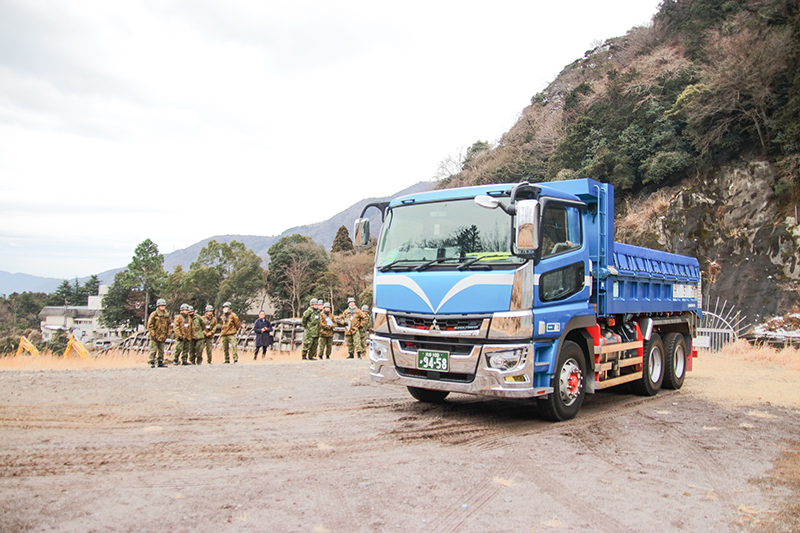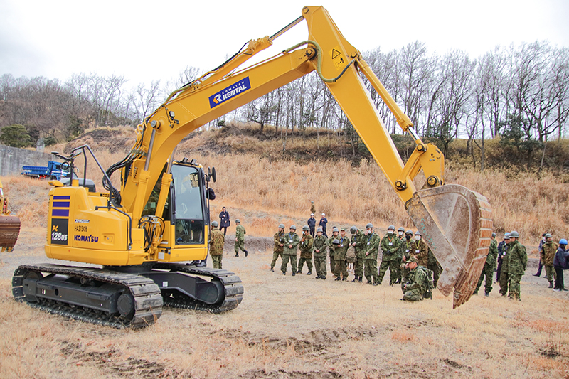 自衛官は、コマツカスタマーサポート㈱が提供したバックホウ2台、協和産業㈱が提供したダンプ1台に交代で試乗し、担当者から説明を受けるなどした。