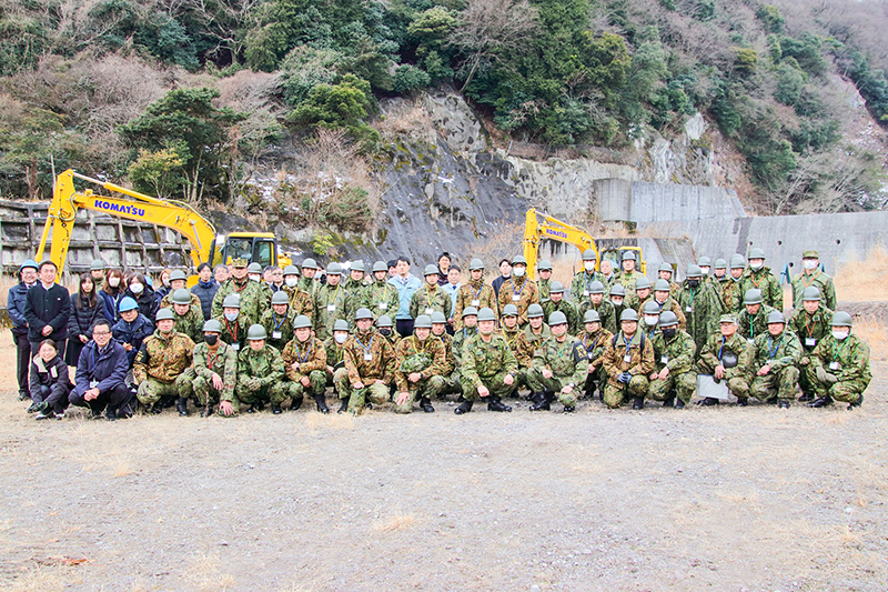 県建設業協会は10日、陸上自衛隊別府駐屯地で定年退官や任期満了退官を予定する自衛官向けに、建設業の仕事を紹介する業種説明会を開いた。また、駐屯地に隣接する別府ICT研修フィールド(境川砂防ダム付近)で、バックホウとダンプの体験試乗会も行った。