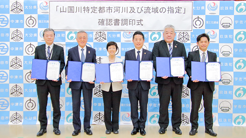 式では、山国川河川事務所の小野朋次所長、県土木建築部河川課の松尾寿一課長が、指定に至るまでの経緯を説明。各市町の首長、小野所長と松尾課長が確認書に調印した。