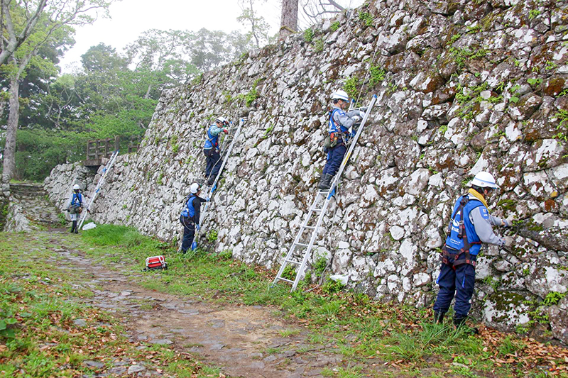 九電グループは18日、佐伯市と共催で佐伯城跡の石垣清掃ボランティアを行った。小雨のなか、草取りやごみ拾いに汗を流した。