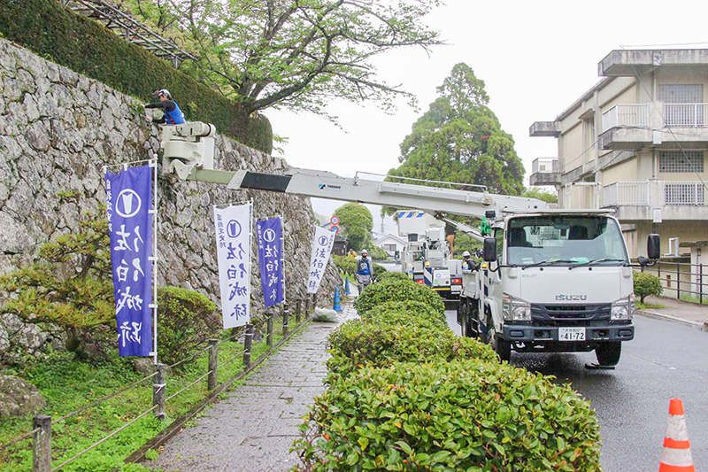 佐伯配電の西川浩幸所長が「無理のない範囲で活動を」とあいさつの後、三の丸跡周辺と山際通り、頂上の本丸跡の石垣に分かれて清掃活動をし、草や落ち葉などを大型ごみ袋で約100袋回収した。九電グループからの参加者は高所作業車、工事用の脚立などを使い、主に石垣上部の作業を担当した。