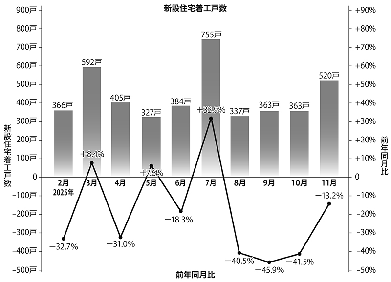 県建築住宅課は、2025年11月の建築着工統計結果を発表した。新設住宅の着工戸数は520戸で、...
