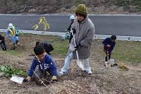 道路法面に記念植樹、西日本高速道路㈱中津工事事務所が児童招いて