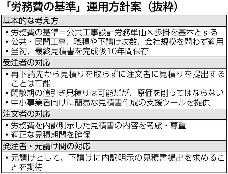 国土交通省は、改正建設業法に基づく「労務費の基準」の運用方針案をまとめた。技能者に支払う賃金の...