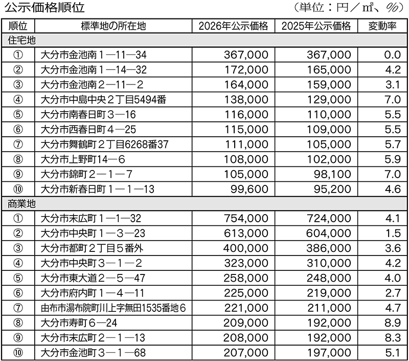 県土木建築部は、県内の2026年地価公示(1平方㍍当たり)の概要を発表した。対前年の県平均変動...