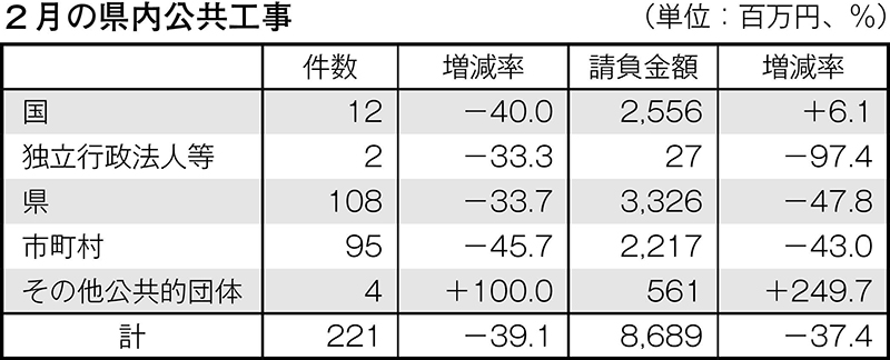 請負金額は37・4%減 2月の公共工事動向〈県内〉