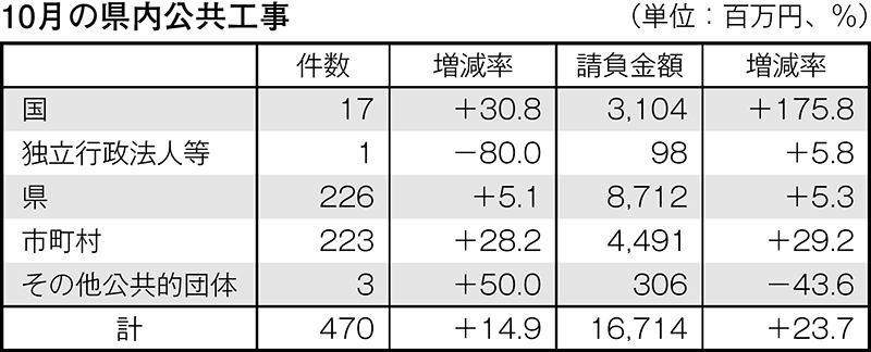 請負金額は23・7%増 10月、公共工事動向〈県内〉