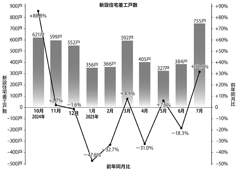 県建築住宅課は、2025年7月の建築着工統計結果を発表した。新設住宅の着工戸数は755戸で、前...