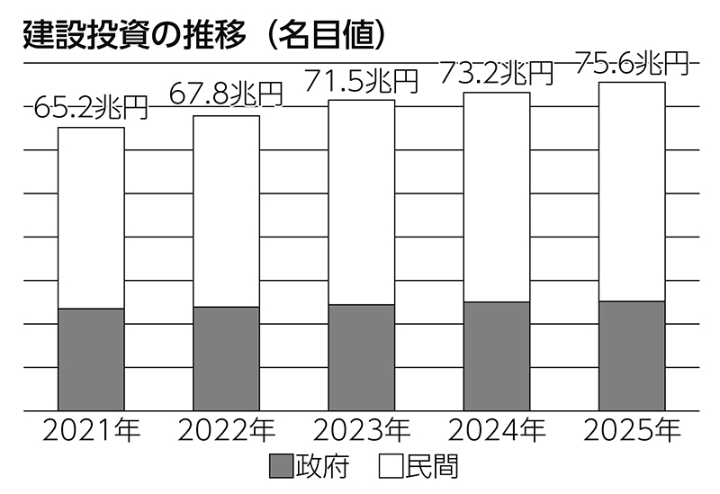 国土交通省は、2025年度の建設投資(名目値)が前年度比3・2%増の75兆5700億円になると...