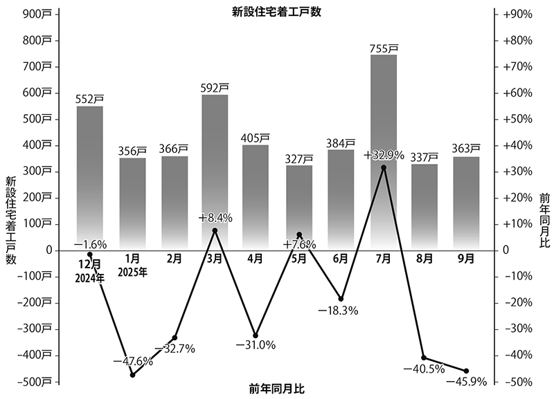 県建築住宅課は、2025年9月の建築着工統計結果を発表した。新設住宅の着工戸数は363戸で、前...