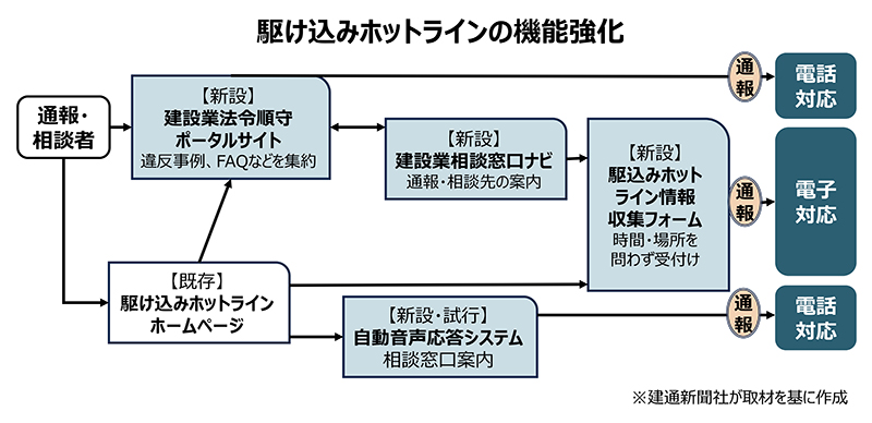 国土交通省は15日、建設業法違反の通報を受け付ける「駆け込みホットライン」の機能を大幅に拡充し...