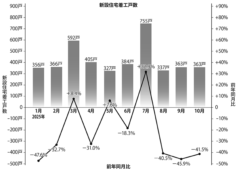 県建築住宅課は、2025年10月の建築着工統計結果を発表した。新設住宅の着工戸数は363戸で、...