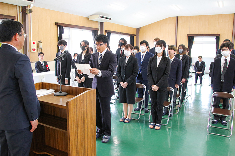 豊後大野市大野町の㈱友岡組(友岡誠一社長)は1日、2026年度の入社式を行った。式には新入社員...