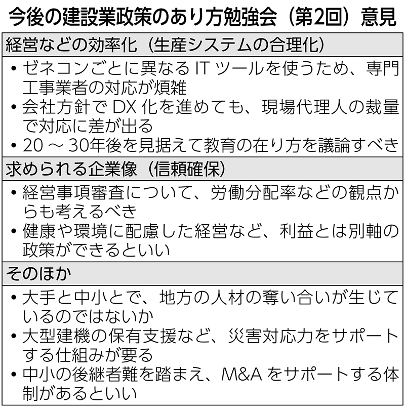 国土交通省の「今後の建設業政策のあり方に関する勉強会」の2回目の会合では、建設業経営や現場のD...