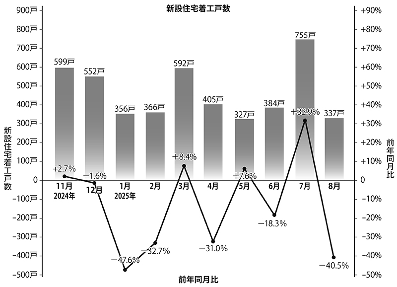 県建築住宅課は、2025年8月の建築着工統計結果を発表した。新設住宅の着工戸数は337戸で、前...