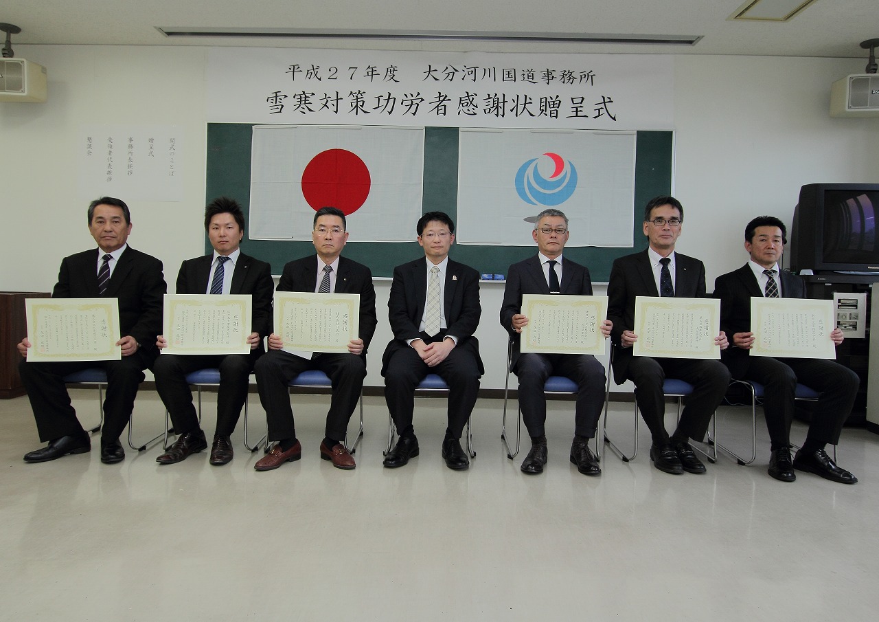 大分河川国道事務所は3月29日、1月の大雪の際、災害基本協定により規制、除雪作業に協力した朝日...
